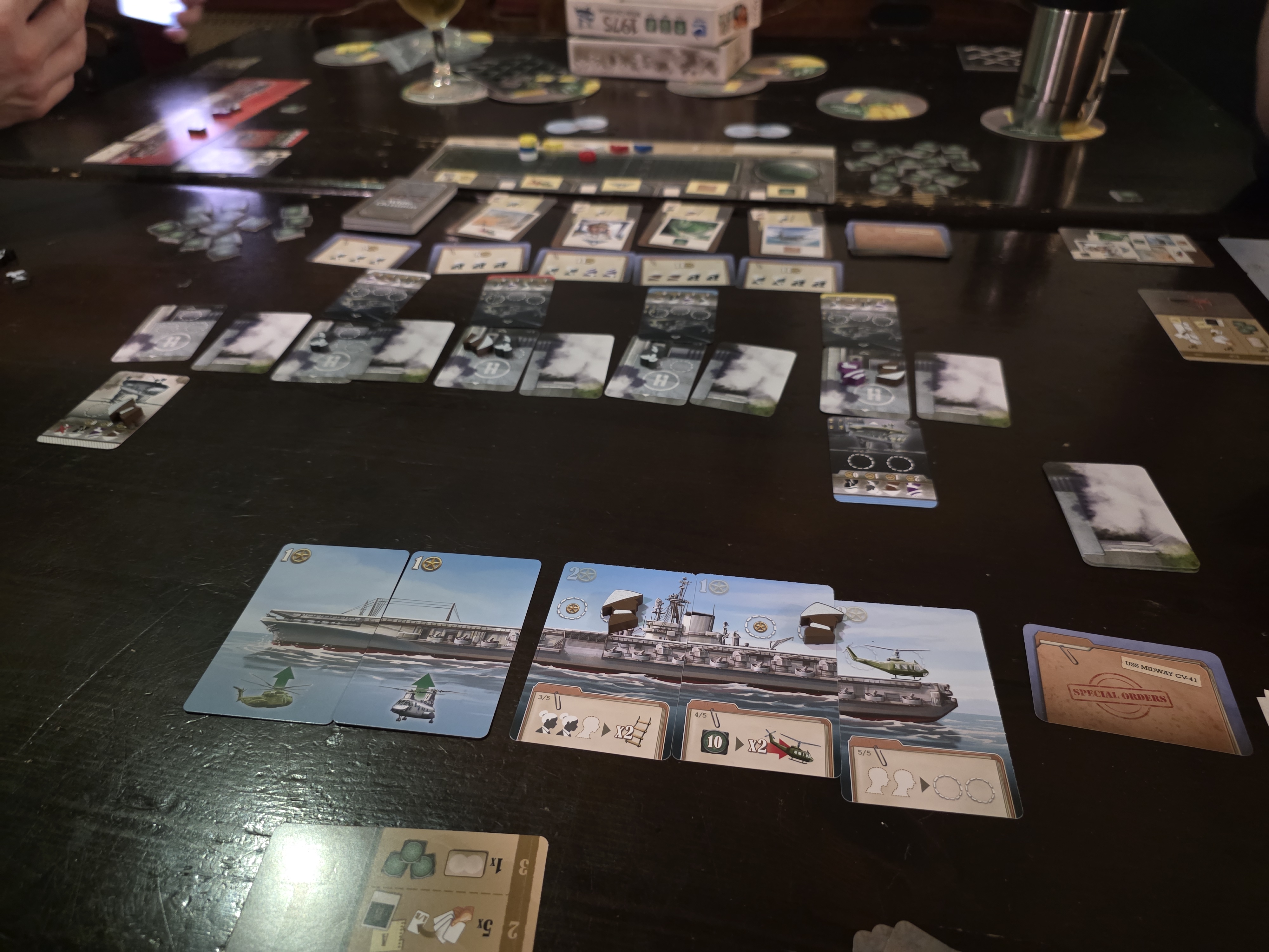Impression: I played a turn at Essen and immediately bought it. Got to a play game now and still really enjoyed it. You are managing helicopter rescuing South Vietnamese during the Fall for Saigon. You are trying to use the right helicopter to pickup the right type and score points for sets. It's got lots of great mechanics and theme and mechanics blend well. Definitely want to play again.
