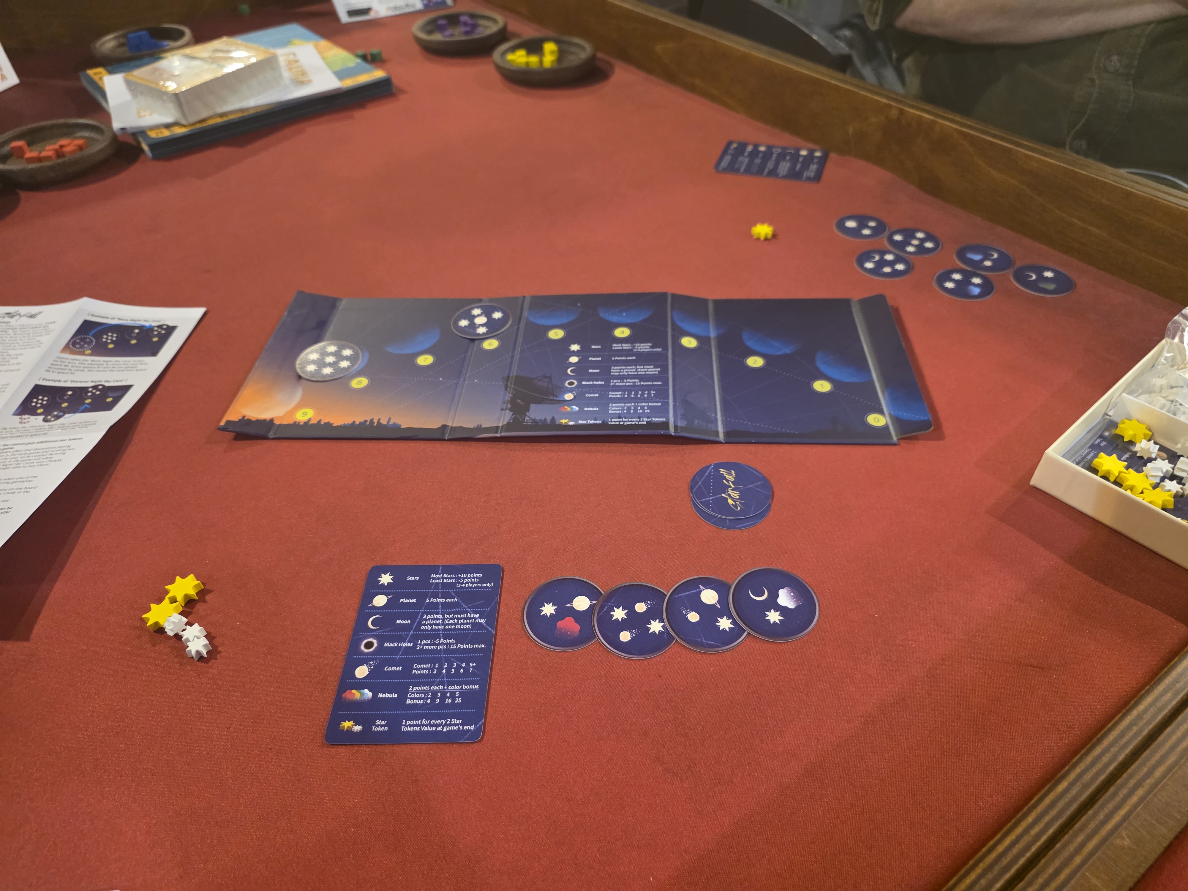 Impression: A sort of conveyor belt bidding game. Each turn you can either place a new start field, move a star field so it costs less or buy a star field for a cost based on its position. You are trying to collect valuable star fields for the right price. Quick and simple.